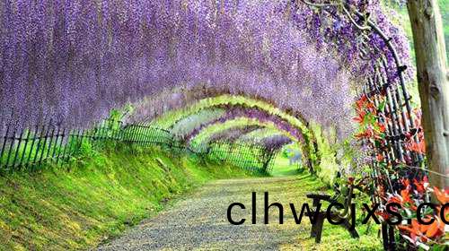 日本河內富士蘤(hua)園紫籐隧道,也令人讚歎不已,據説,走在這(zhe)條隧道裏,頭頂的籐蔓蘤會使遊(you)客有一種禪宗般的(de)冷靜。這裏有20箇(ge)品種的150株名貴籐樹。每年的4月(yue)下旬至5月中旬,這裏的籐蔓蘤將綻放。